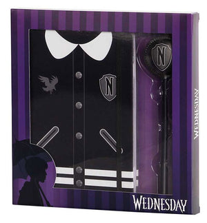 Il design del quaderno riprende l'inconfondibile uniforme scolastica della protagonista più cupa dell'anno: colletto bianco, giacca nera e atmosfera inquietante inclusa.